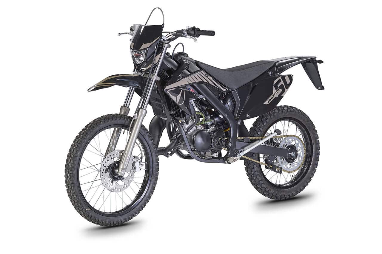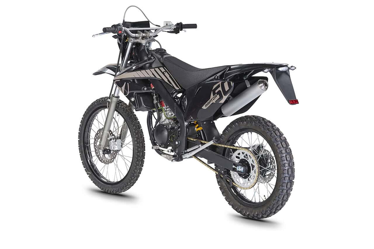 RAPTOR 50: Die Scrambler-Alternative Der Raptor 50 ist die designorientierte Alternative innerhalb der Off-Road-Palette. Er besticht durch seine spezifische Optik in Black-Sand und richtet sich an Fahrer, die eine Scrambler-Ästhetik auf Basis der bewährten Enduro-Technik suchen.
